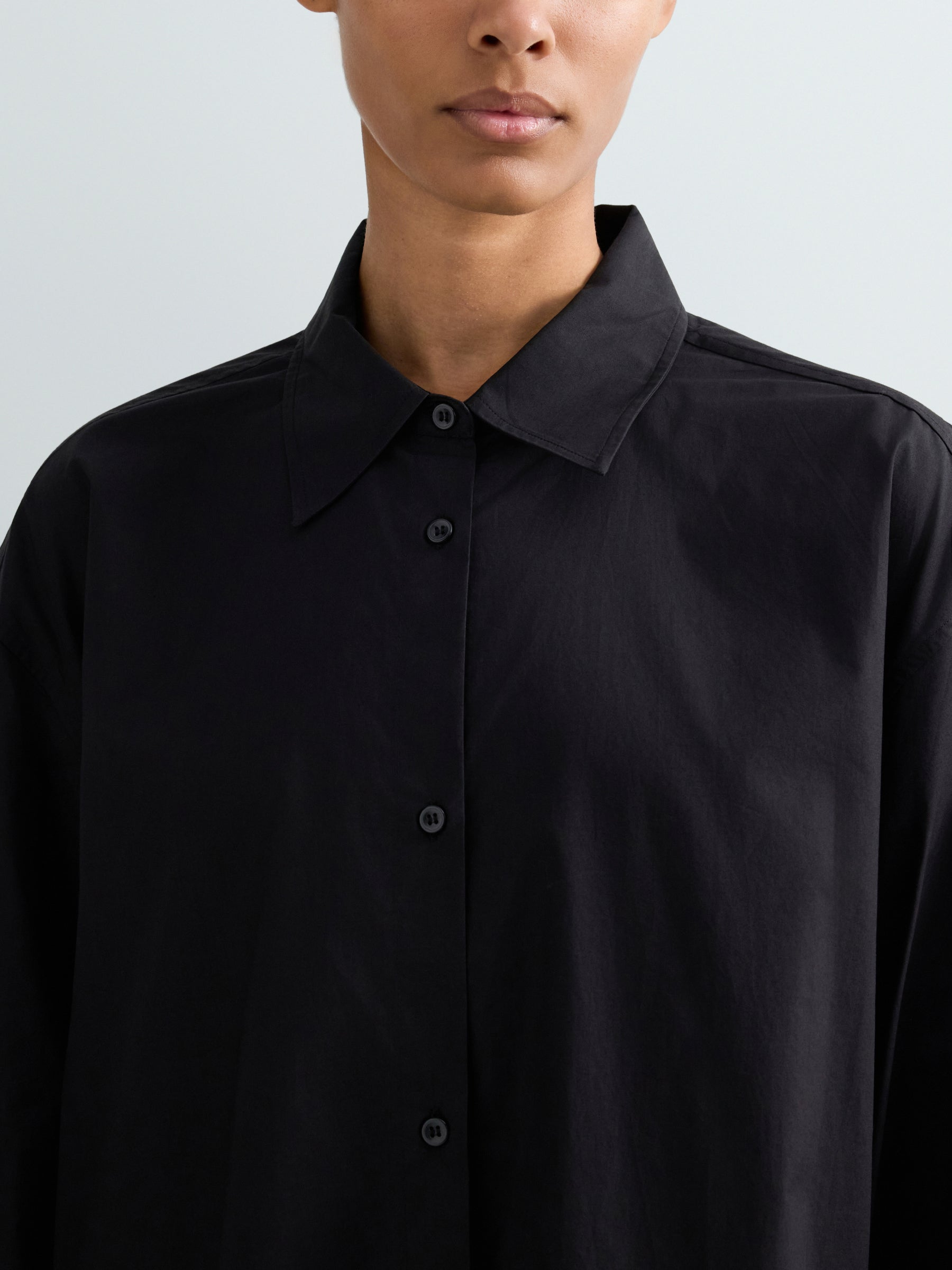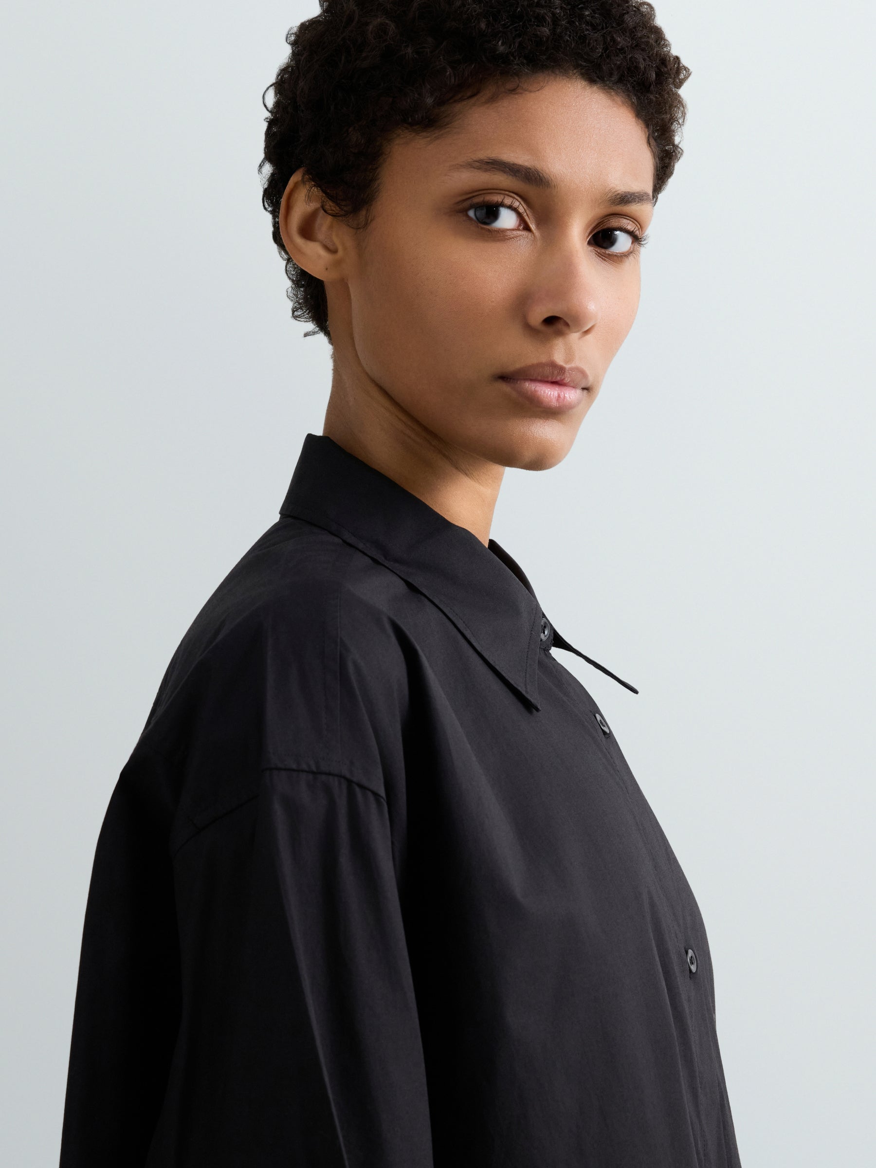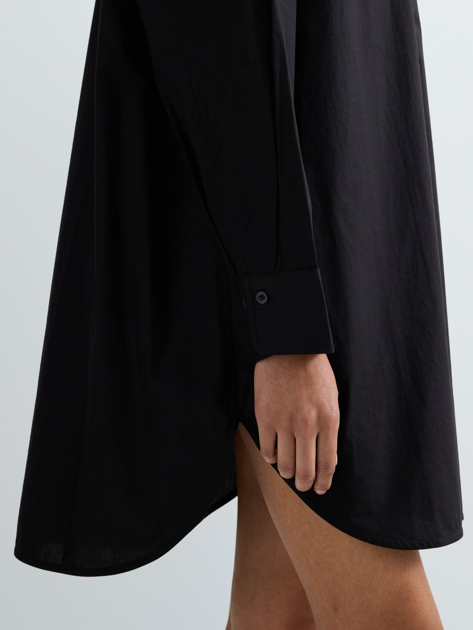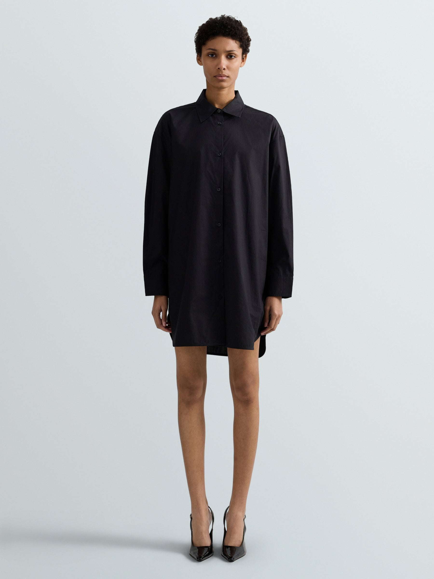 W9238. 000.85480 Lengva, trumpa suknelė išsiskirianti asimetrišku dizainu – nugara ilgesnė, priekis trumpesnis, su subtiliai krentančiu efektu. Marškinių tipo sagų užsegimas kerta liemenį ir tęsiasi į šoną. Ilgomis rankovėmis su sagomis užsegamais rankogaliais, marškinių apykakle ir nugaros jungu. Vieną rankogalį puošia mūsų ikoninis siuvinėtas „R“ simbolis.