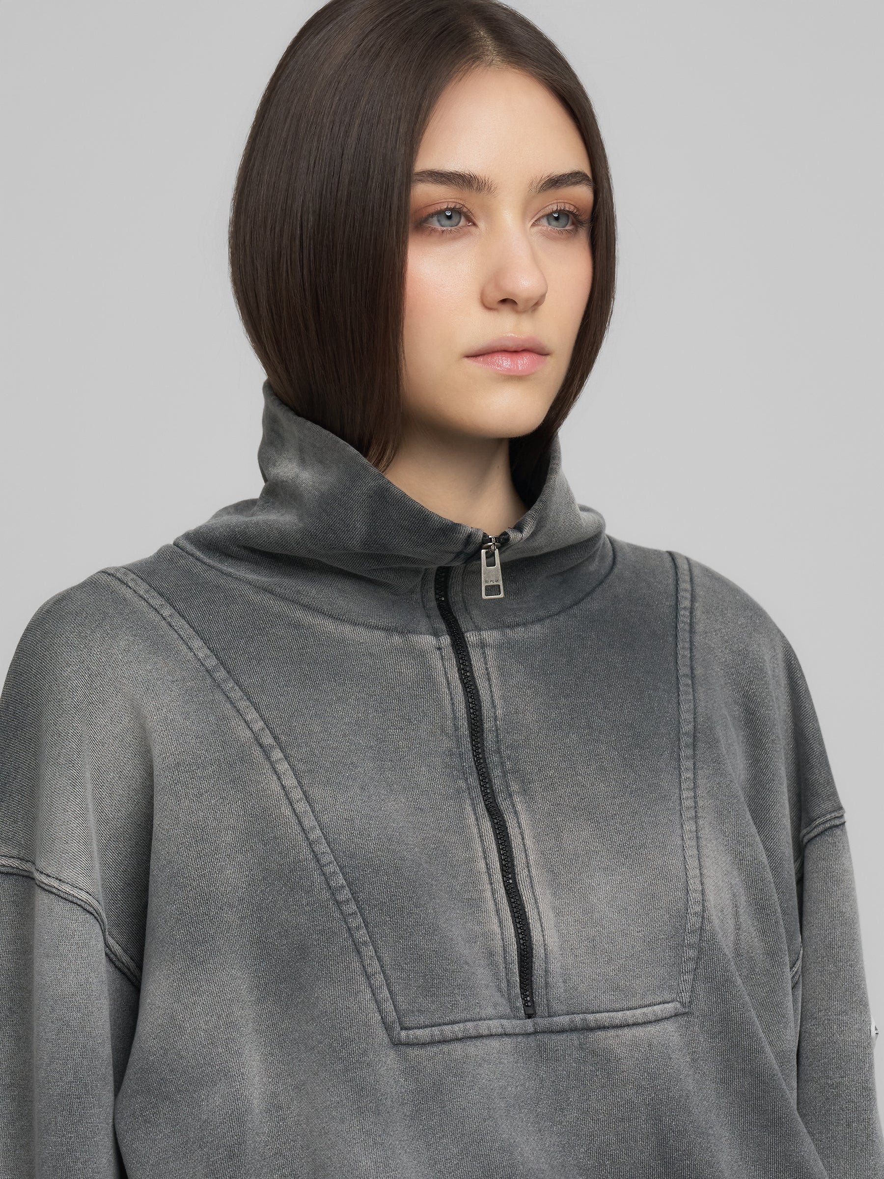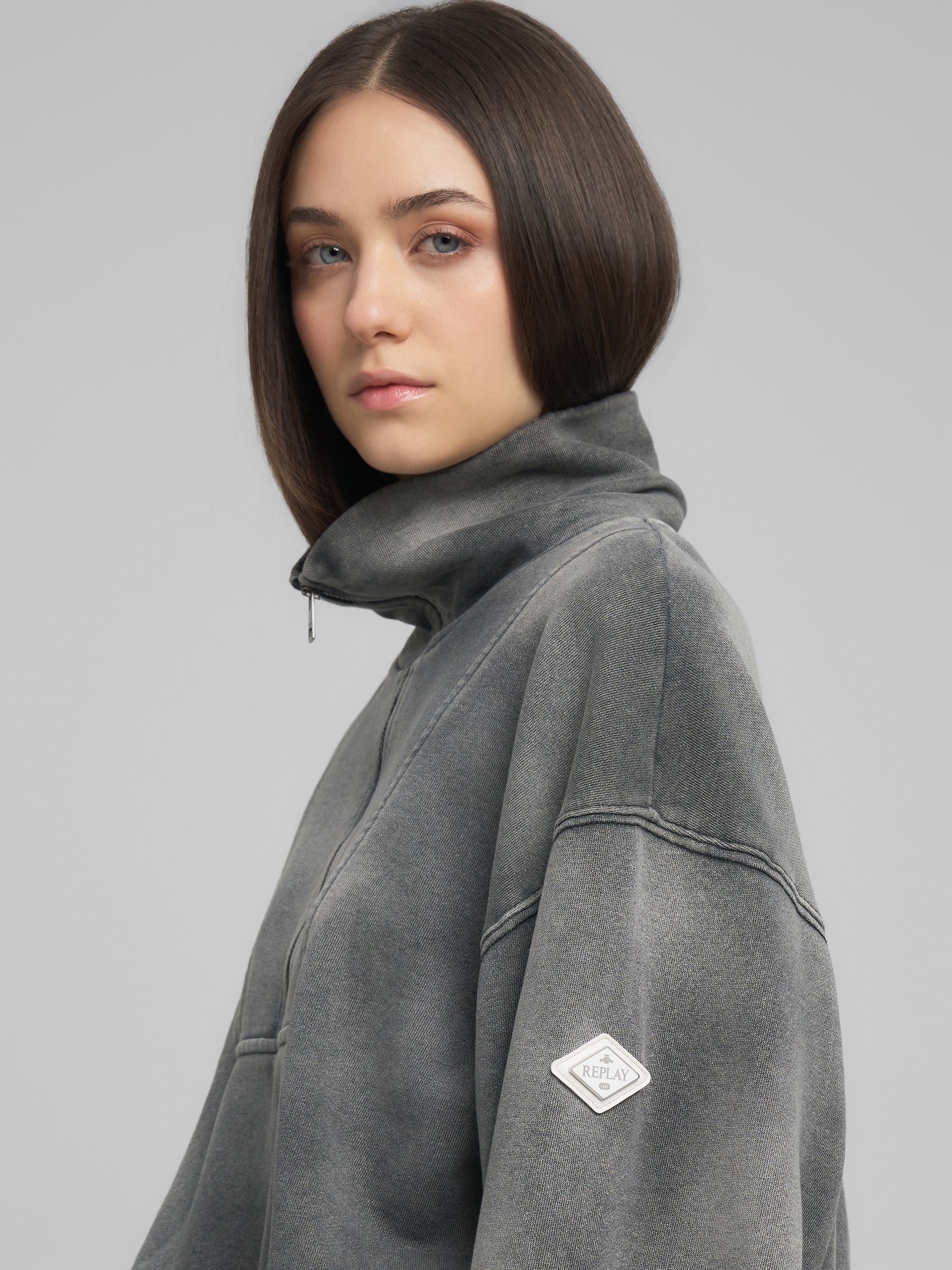 W3460A.000.23820B Džemperis ilgomis rankovėmis su kaklo užtrauktuku ir "REPLAY" įsiuvu ant rankovės. Su prilaikančia guma ties juosmeniu.