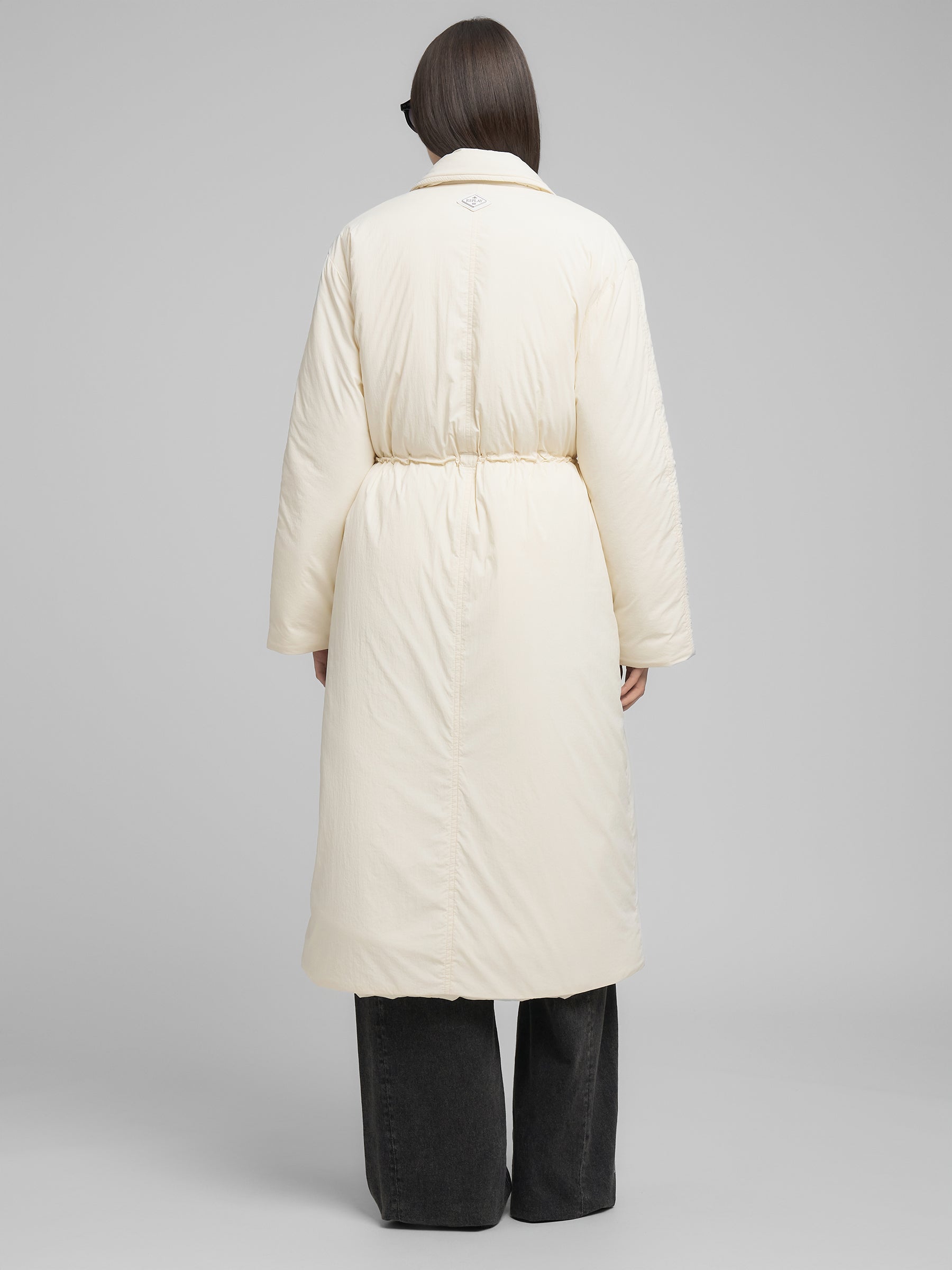 W7919 .000.85272 Ilgas paltas , ilgomis rankovėmis ir "V" formos iškirpte. Su dviem kišenėmis šonuose. Dirželis ties juosmeniu. "REPLAY" įsiuvas nugaroje.