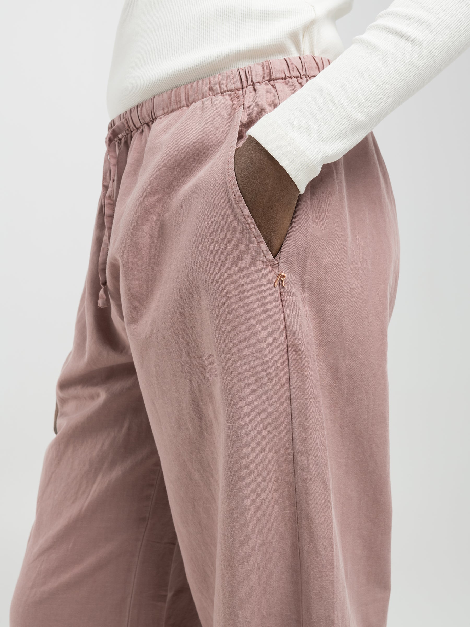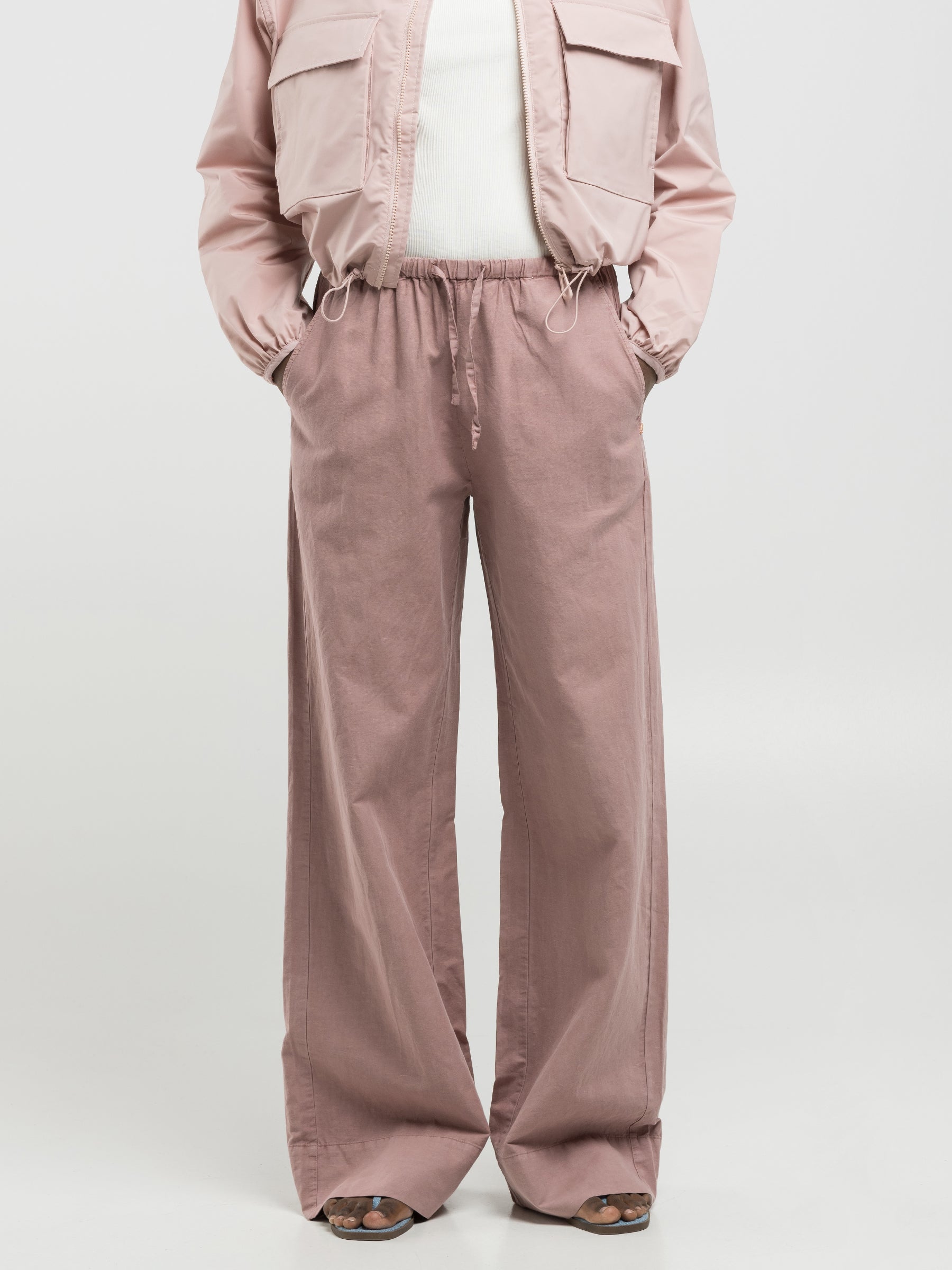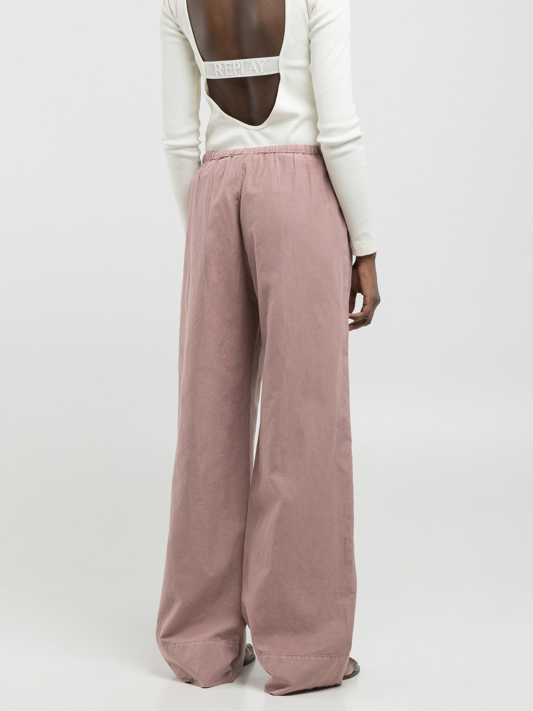 W8131A.000.85176G Plačios kelnės ,žemo liemens su dviem kišenėmis priekyje ir "R" raidės įsiuvu šone. Su prilaikančiu raišteliu ties juosmeniu.