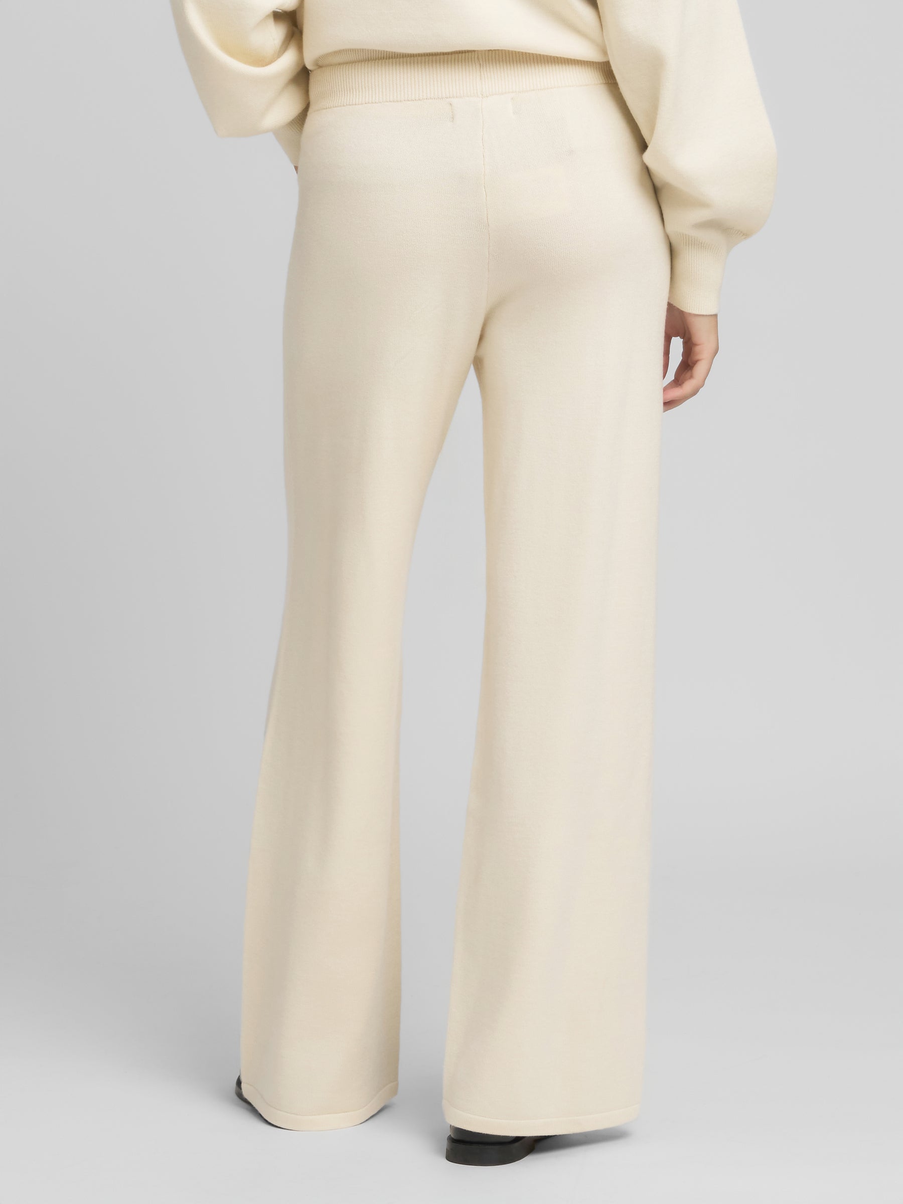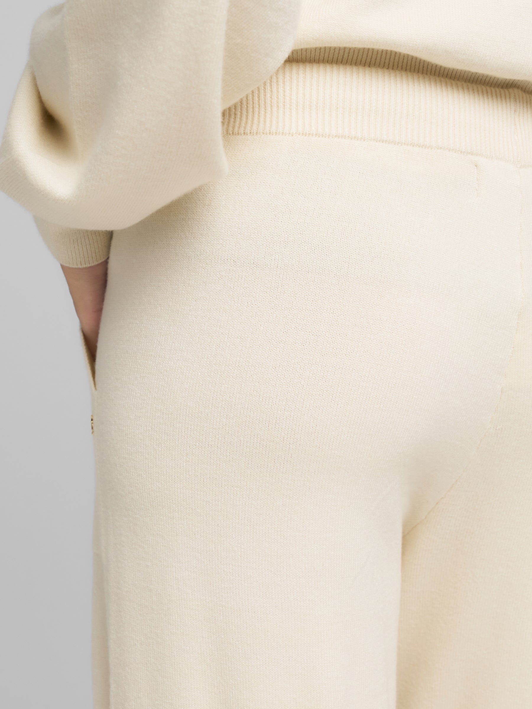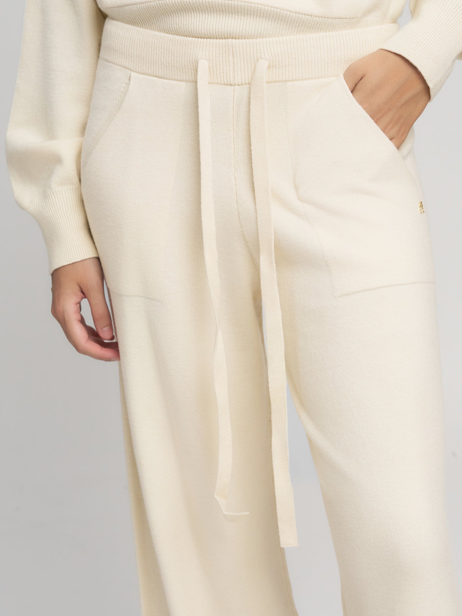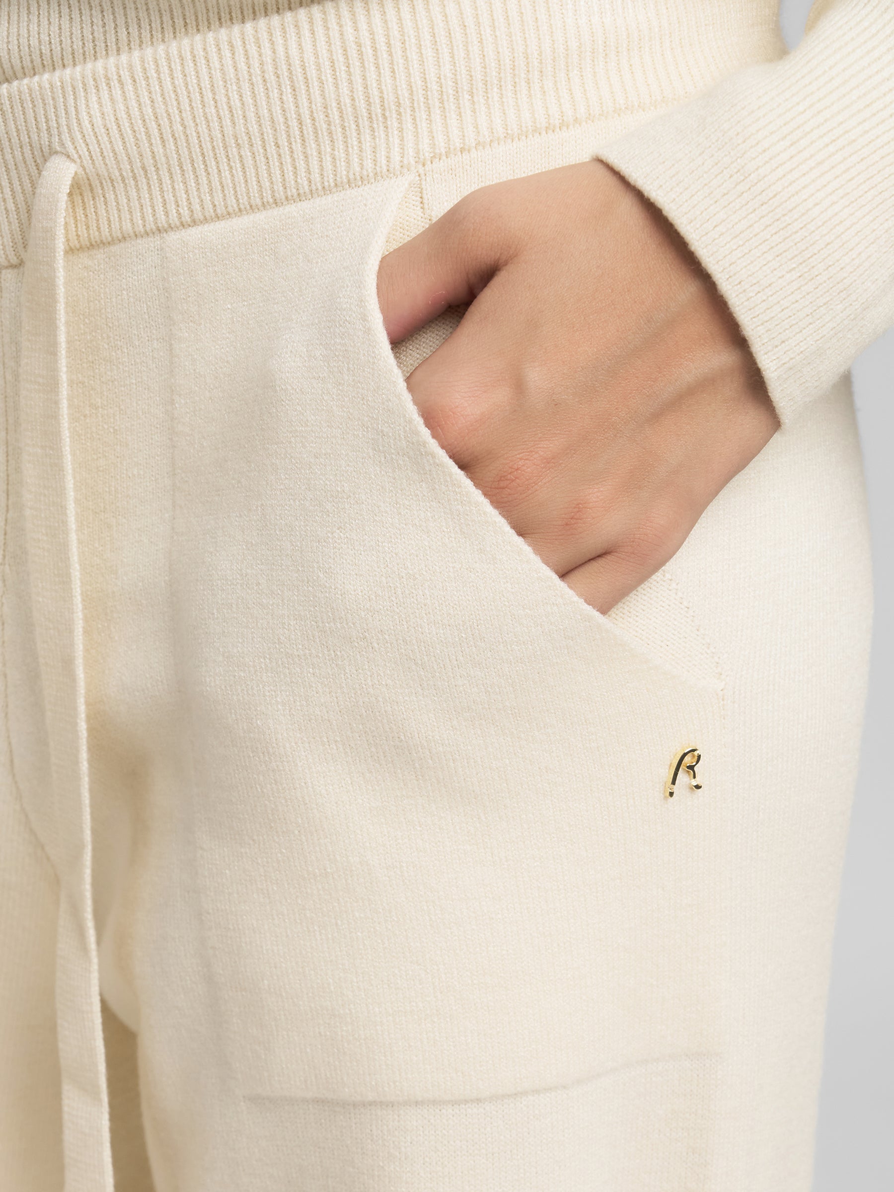 DK3902.000.G23372 Plačios megztos kelnės su dviem kišenėmis priekyje. Su raišteliu. "R" raidės įsiuvas šone.