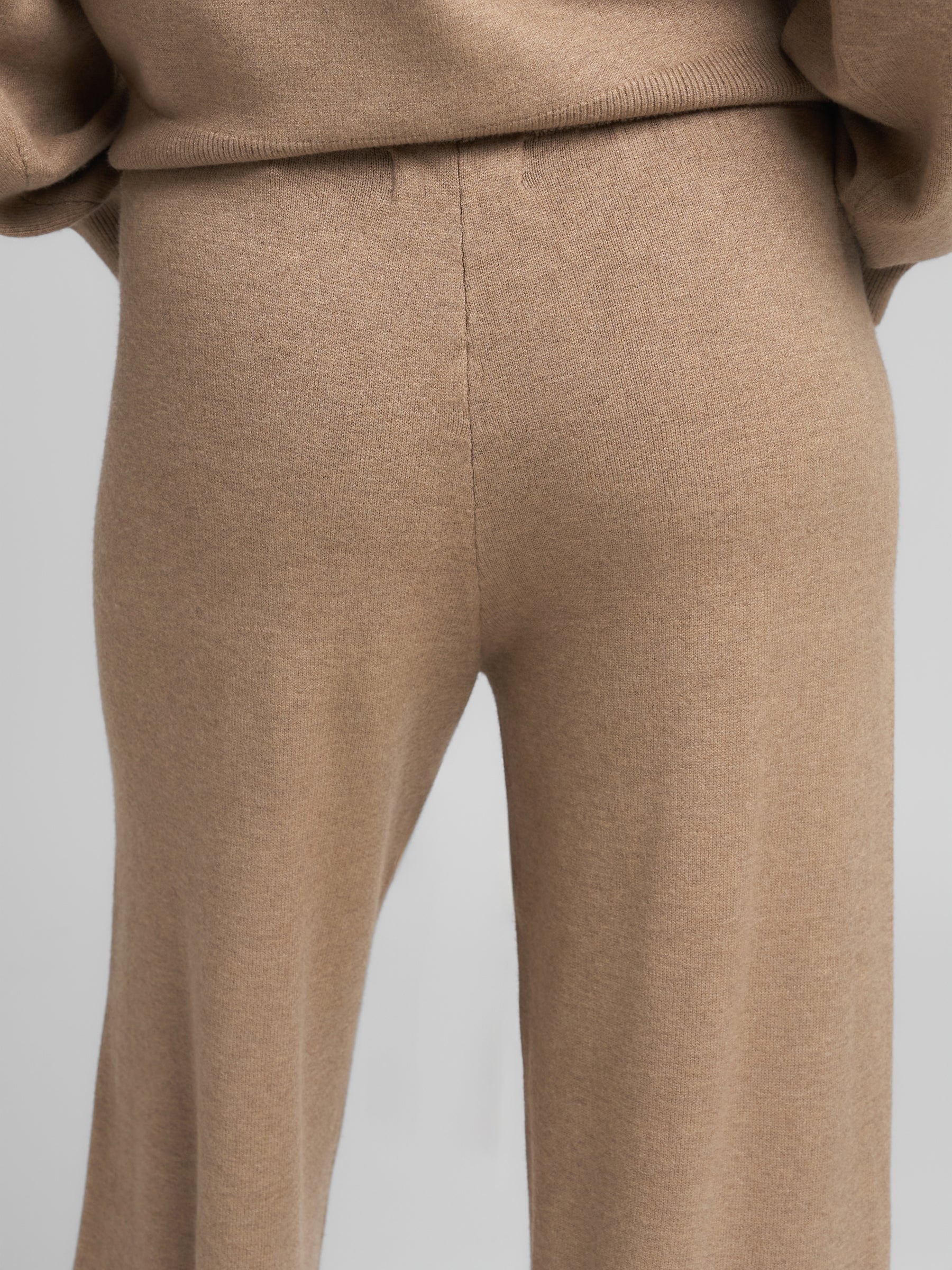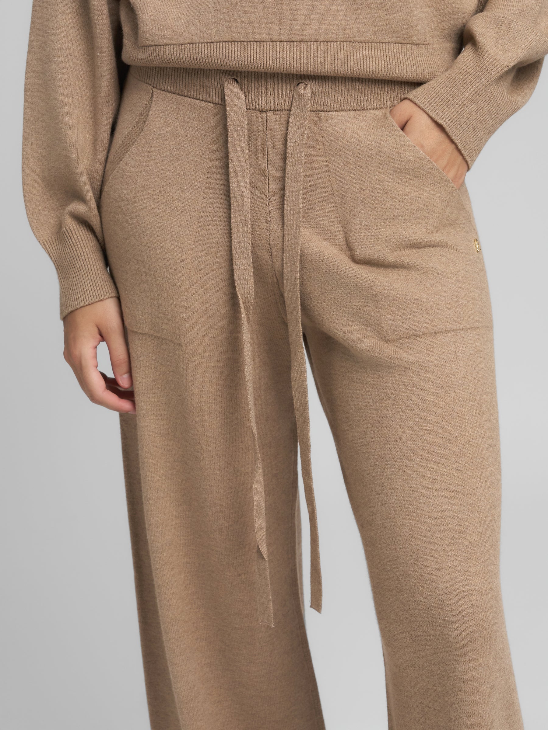 DK3902.000.G23372 Megztos kelnės su dviem kišenėmis priekyje ir raišteliu ties juosmeniu. Su "R" raidės įsiuvu ant kišenės.