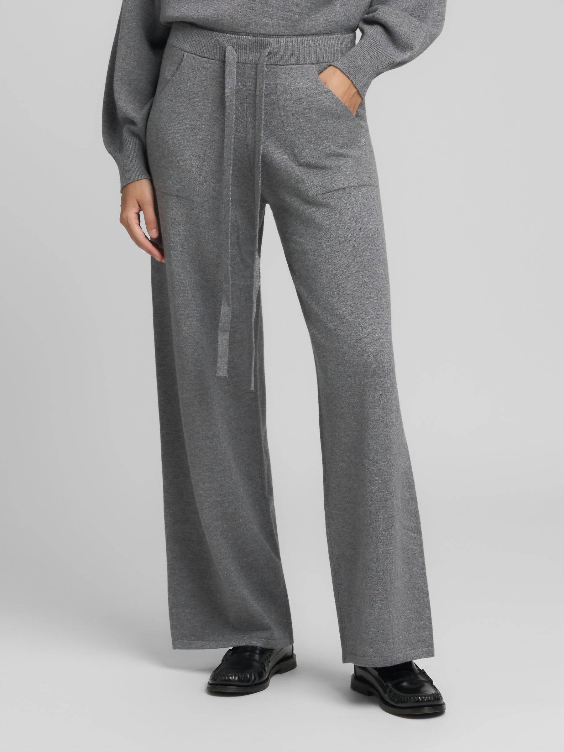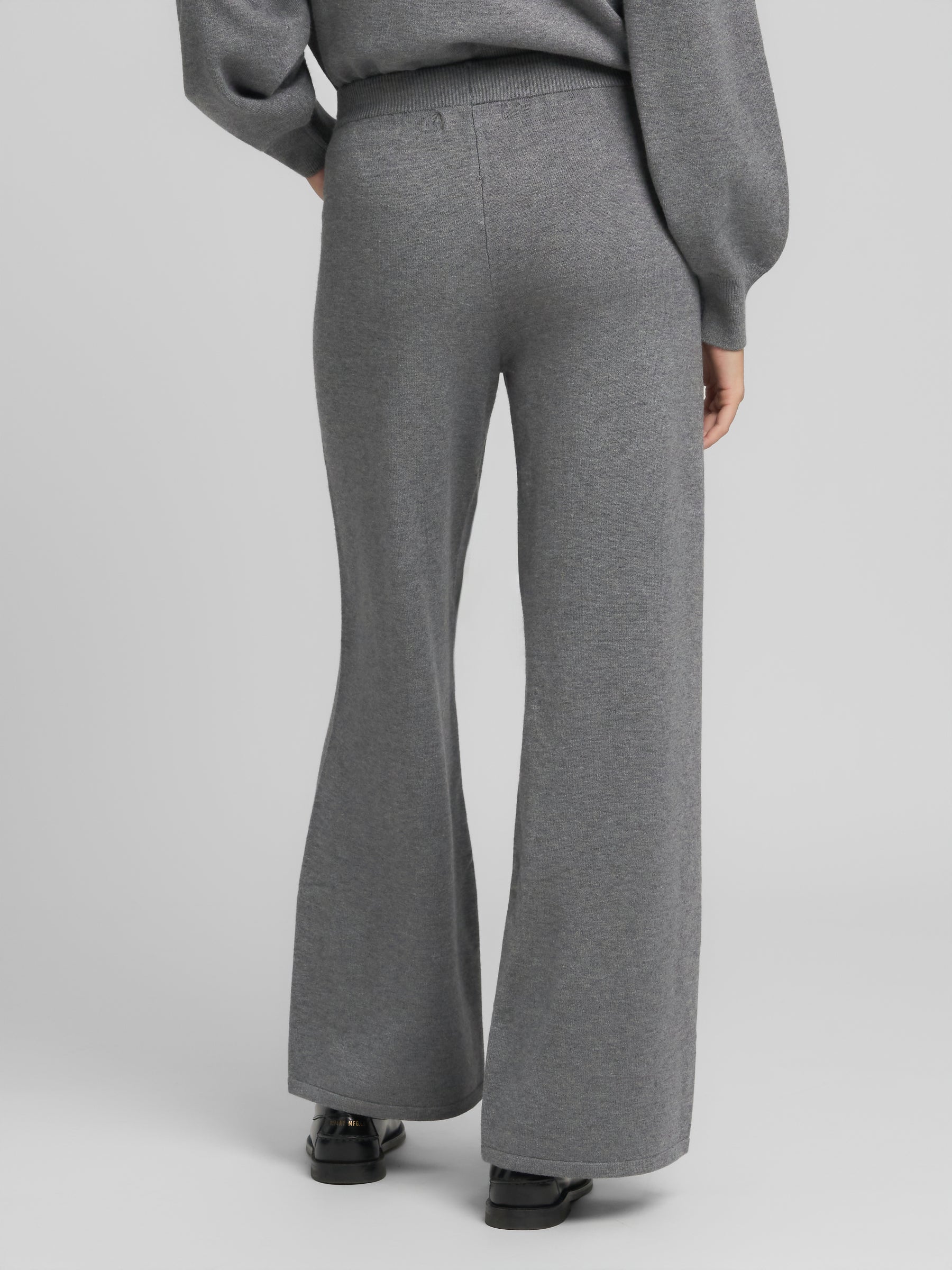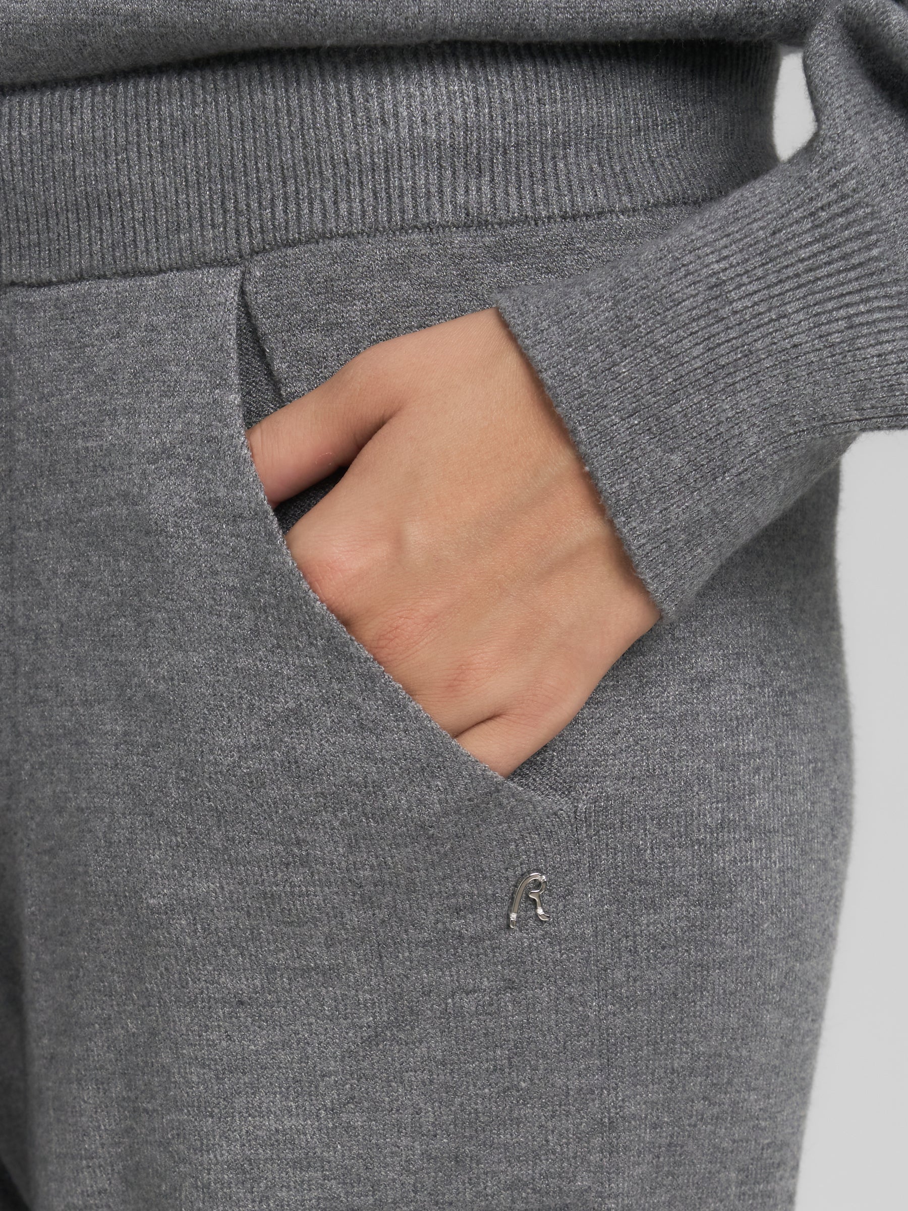 DK3902.000.G23372 Megztos kelnės su dviem kišenėmis priekyje ir raišteliu ties juosmeniu. Su "R" raidės įsiuvu ant kišenės.