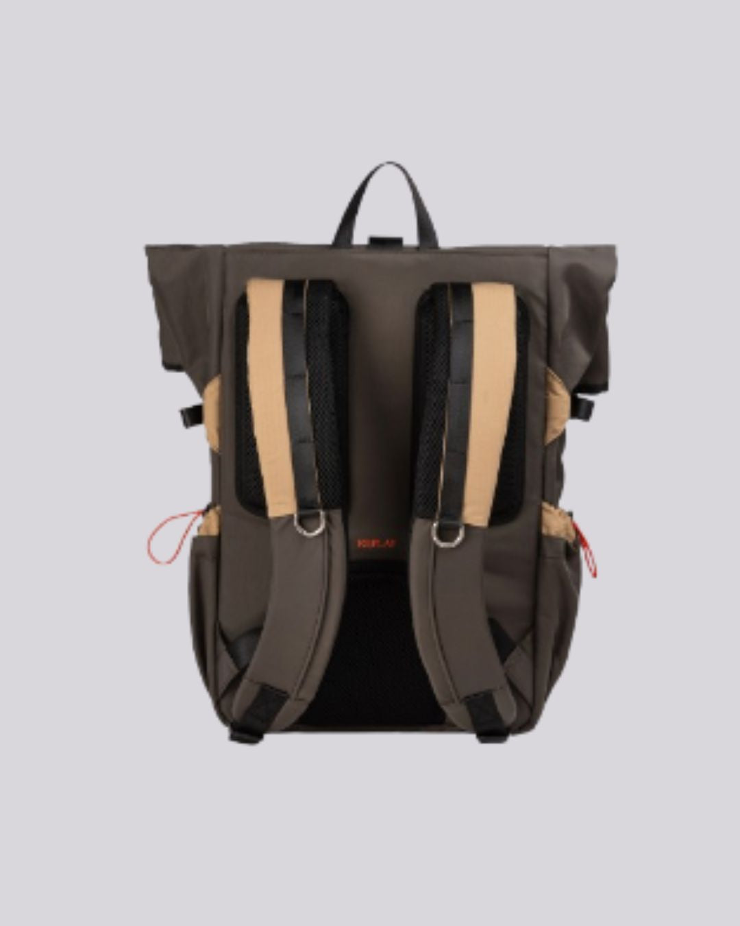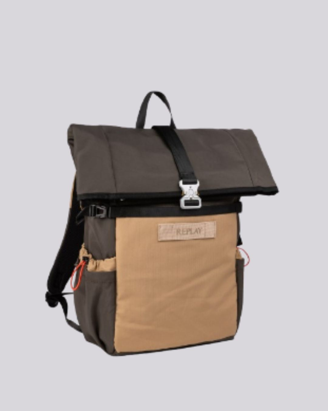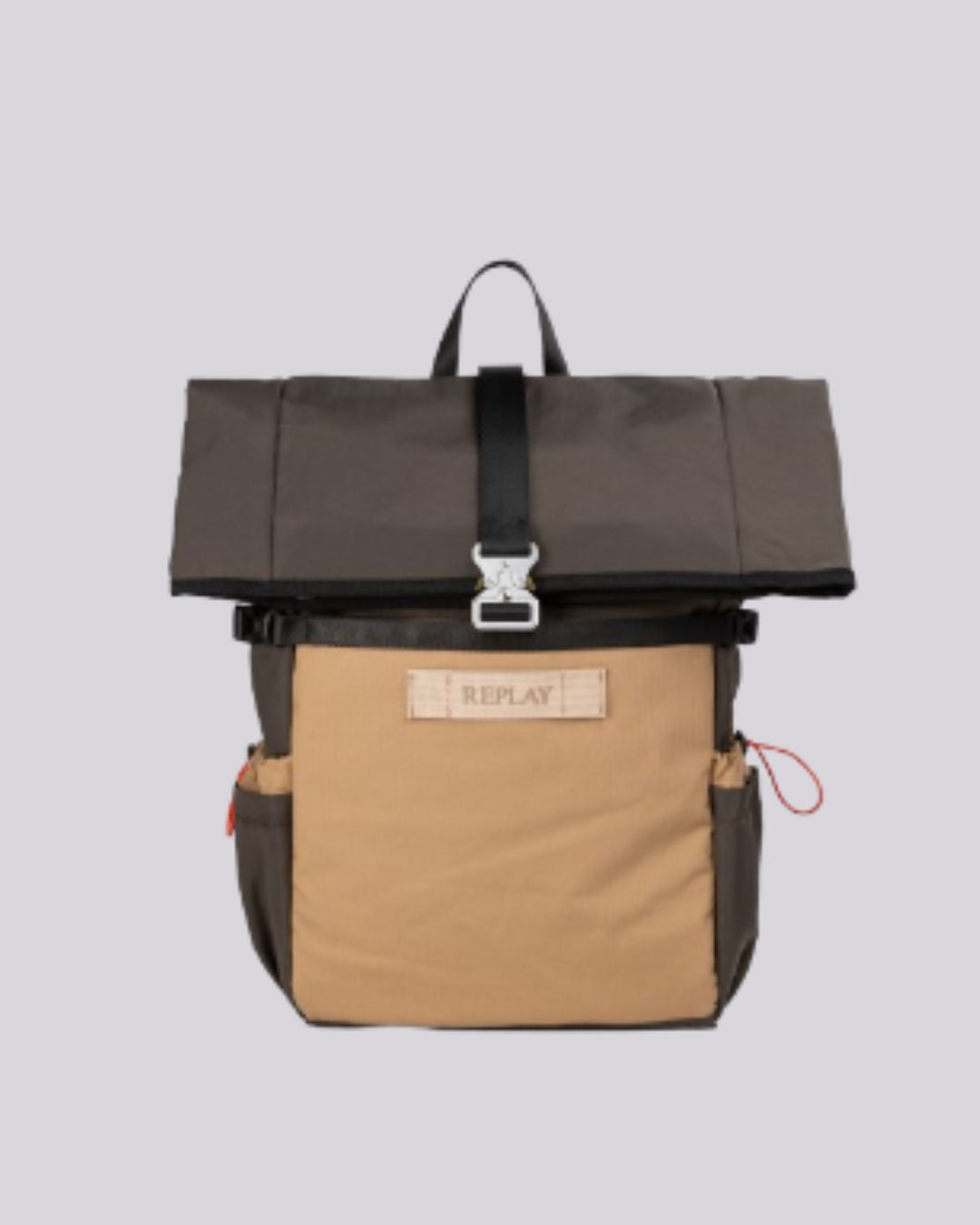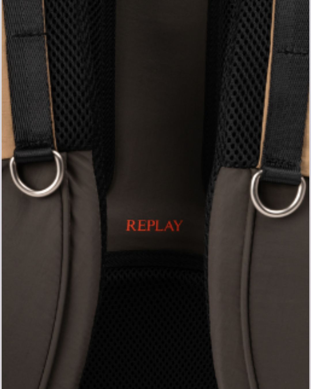 FM3728.000.A2014A Išskirtinio dizaino kuprinė su rankena ir reguliuojamo dydžio petnešomis. "REPLAY" įsiuvas priekyje.