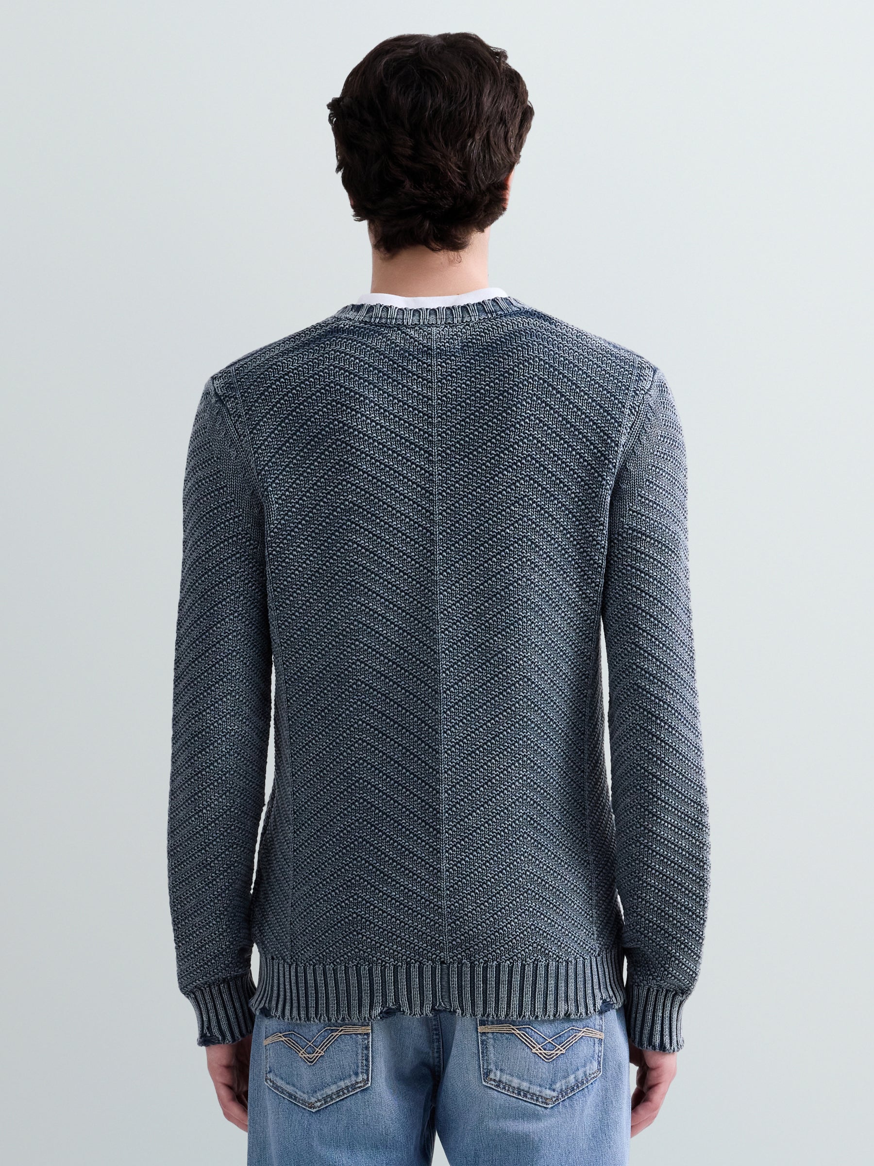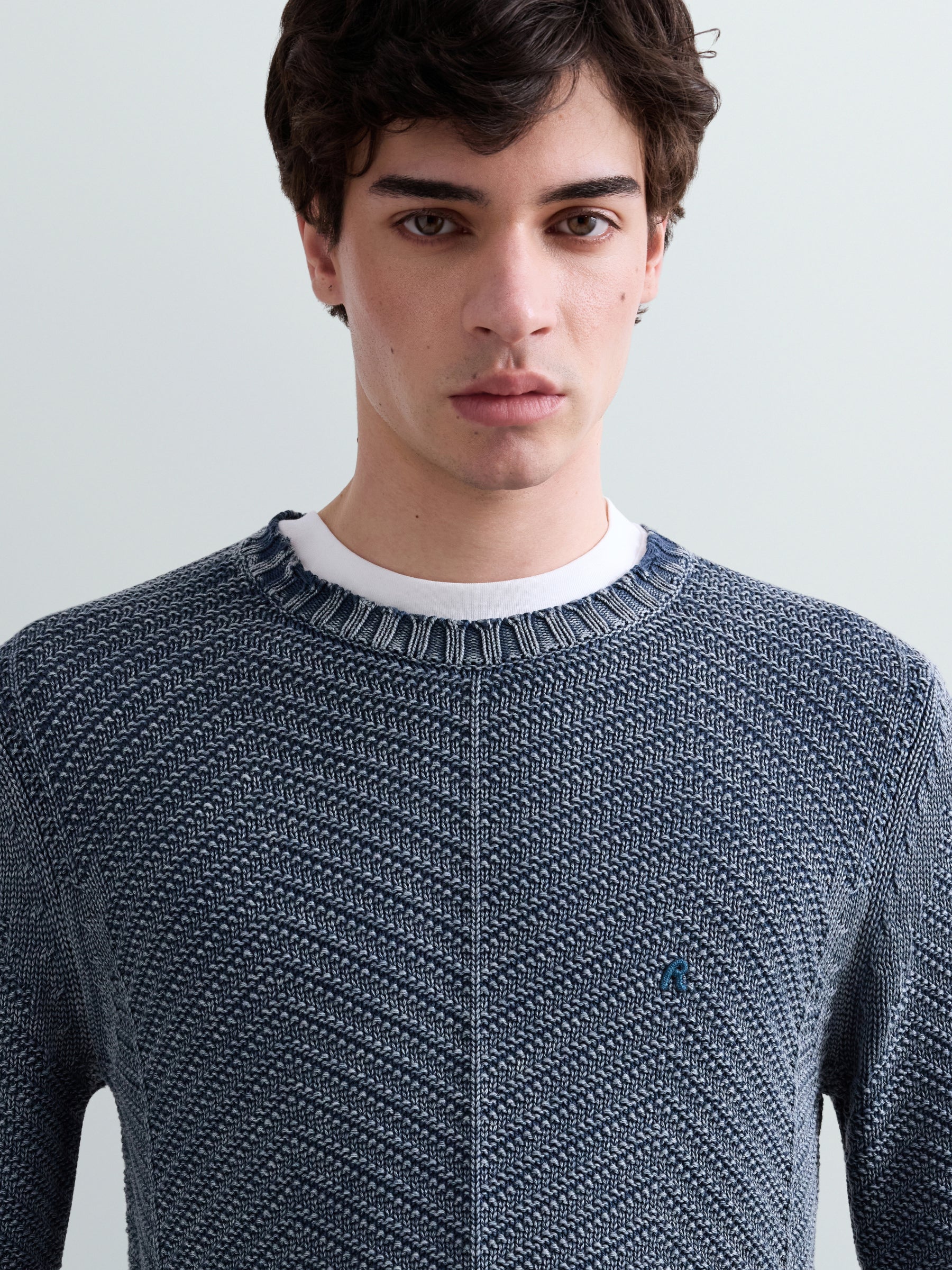 UK5168.000.G21280Q Megztinis ilgomis rankovėmis ir apvaliu kaklu. Su "R" raidės įsiuvu ant krūtinės.