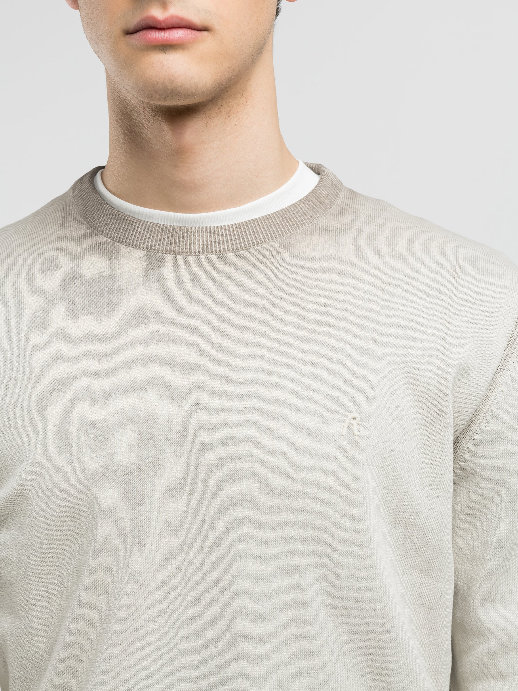 UK4705.000.G20785A Megztinis ilgomis rankovėmis, apvaliu kaklu. Su "R" raidės įsiuvu ant krūtinės.