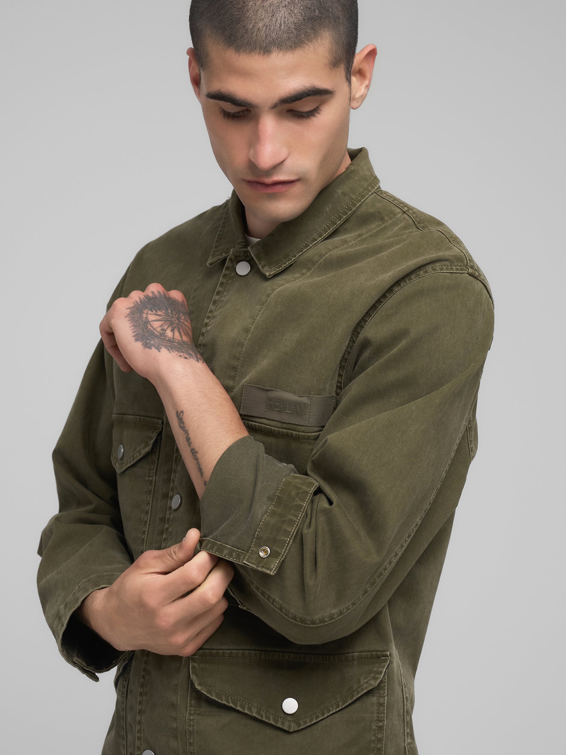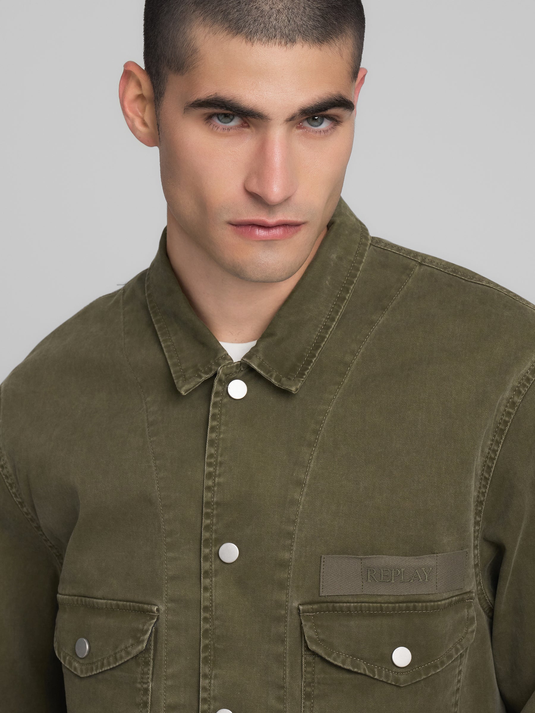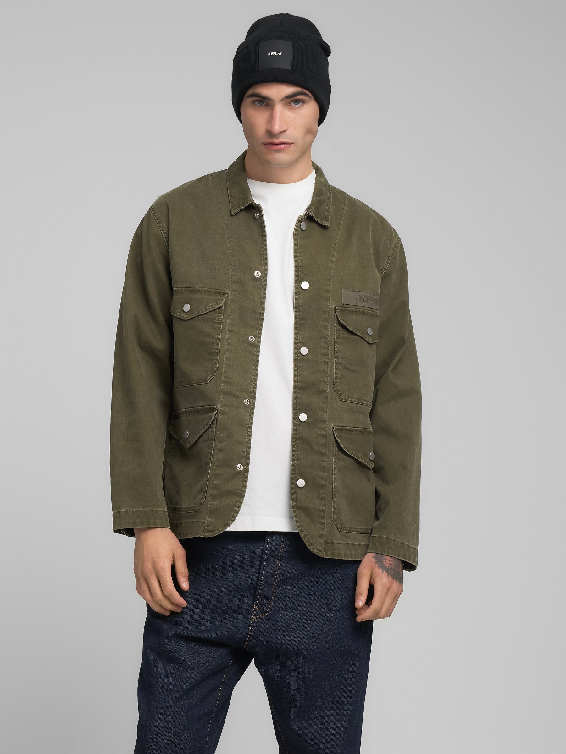 M8495A.000.85393 Švarkas ilgomis rankovėmis su keturiomis kišenėmis priekyje ir "REPLAY" įsiuvu. Užsegimas spaudėmis.