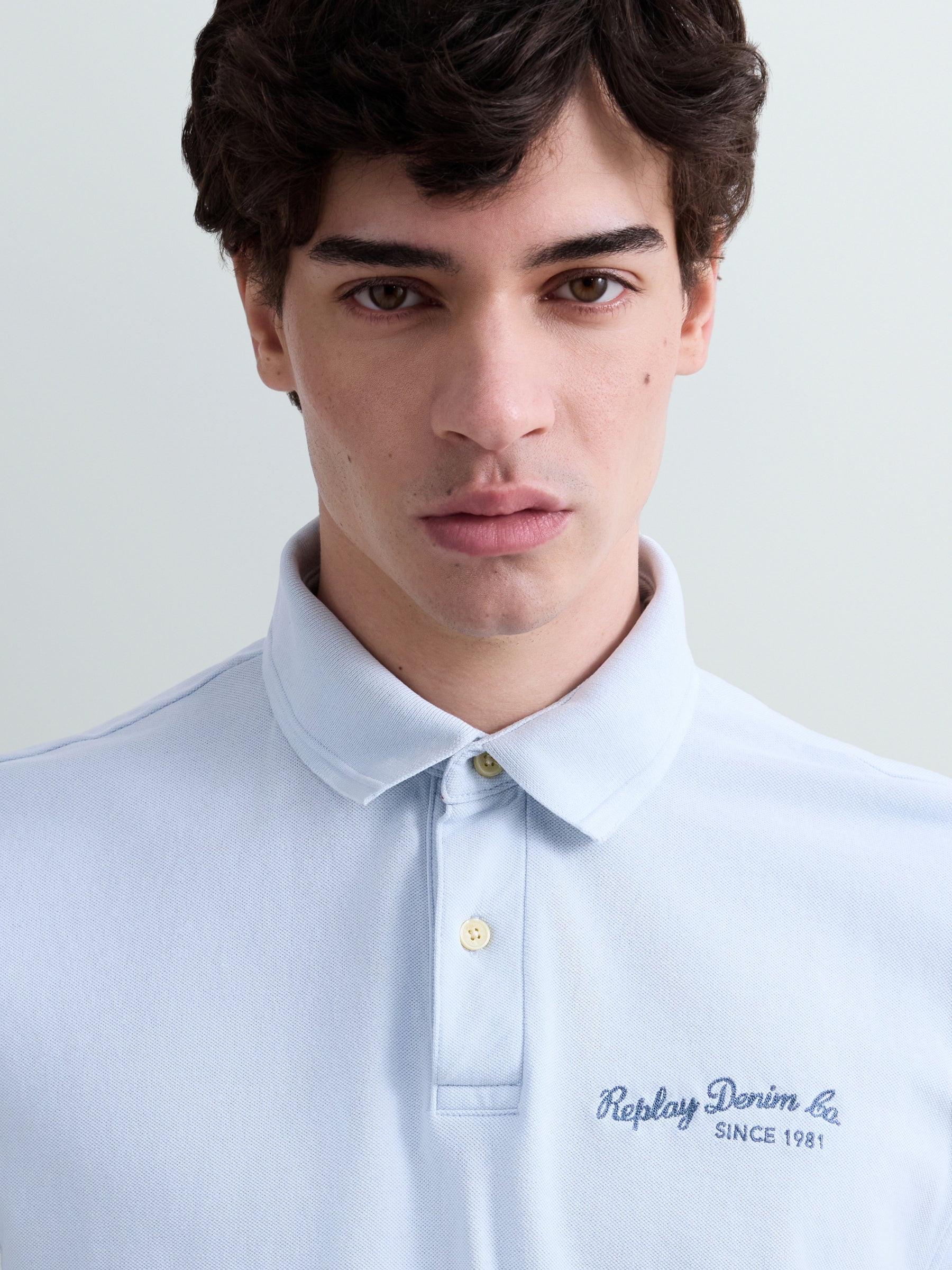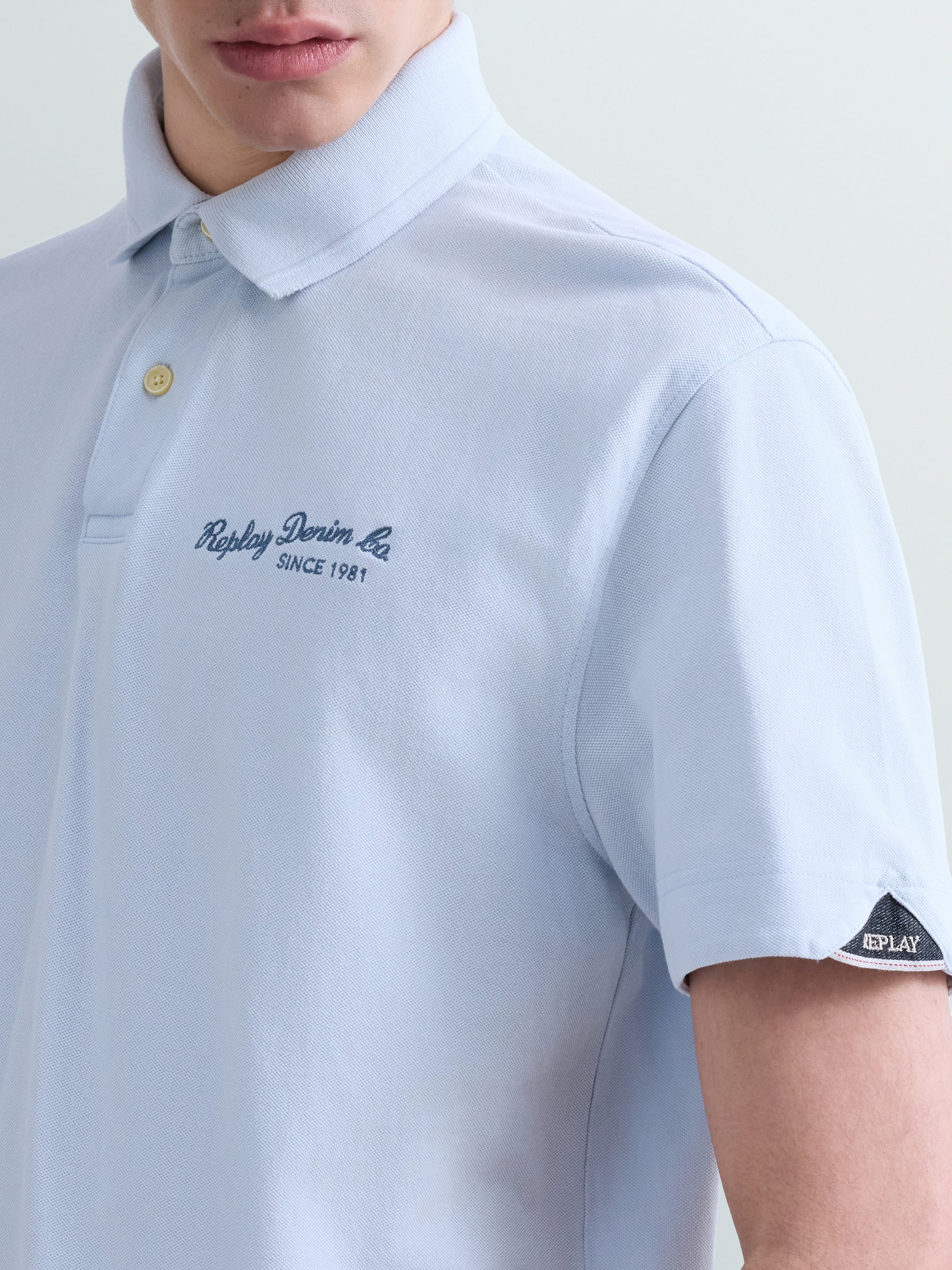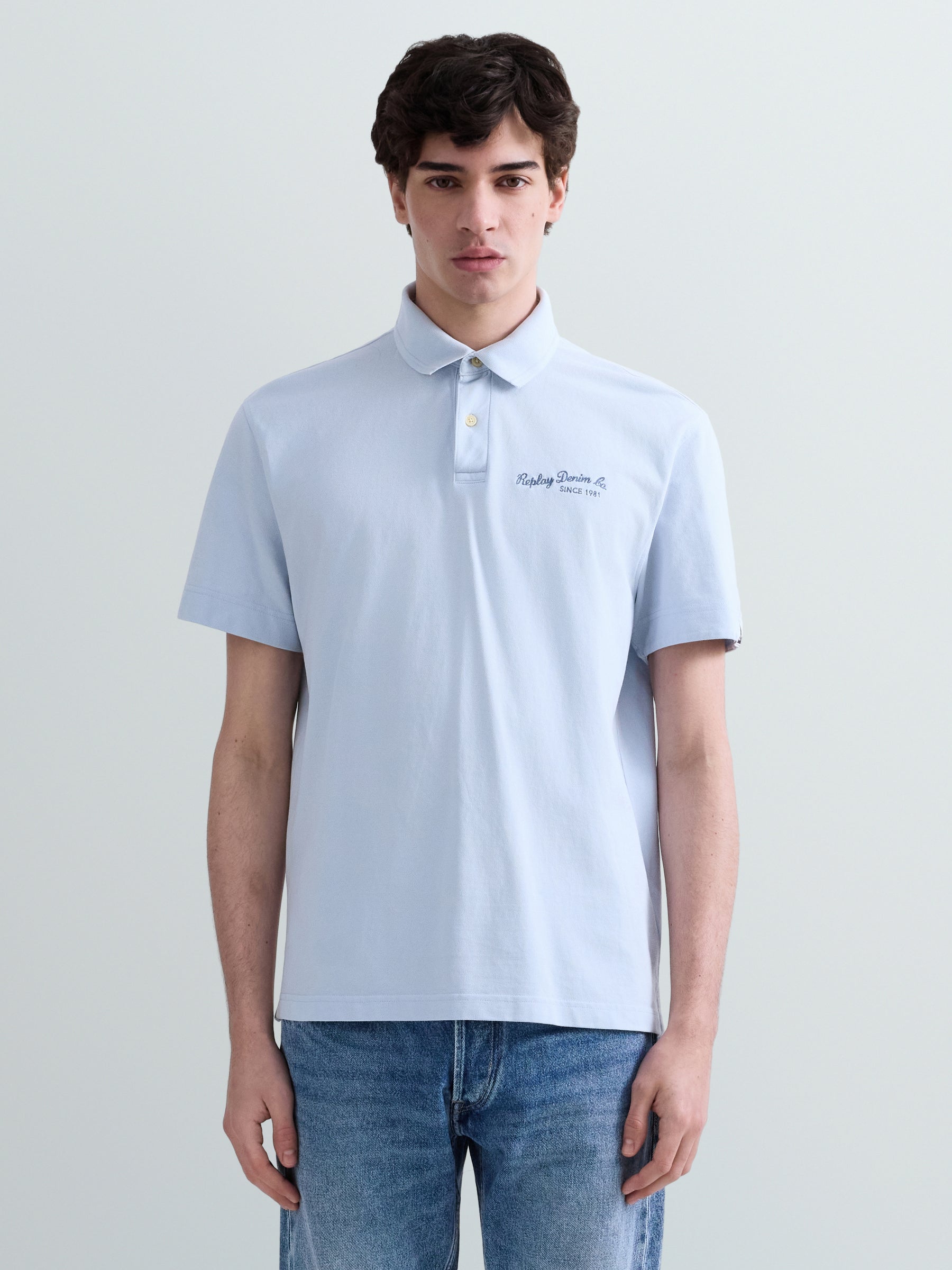 M3432 .000.22696G Polo marškinėliai trumpomis rankovėmis ir "REPLAY" įsiuvu ant krūtinės ir rankovės. Su skeltukais šonuose. Užsegimas sagomis.