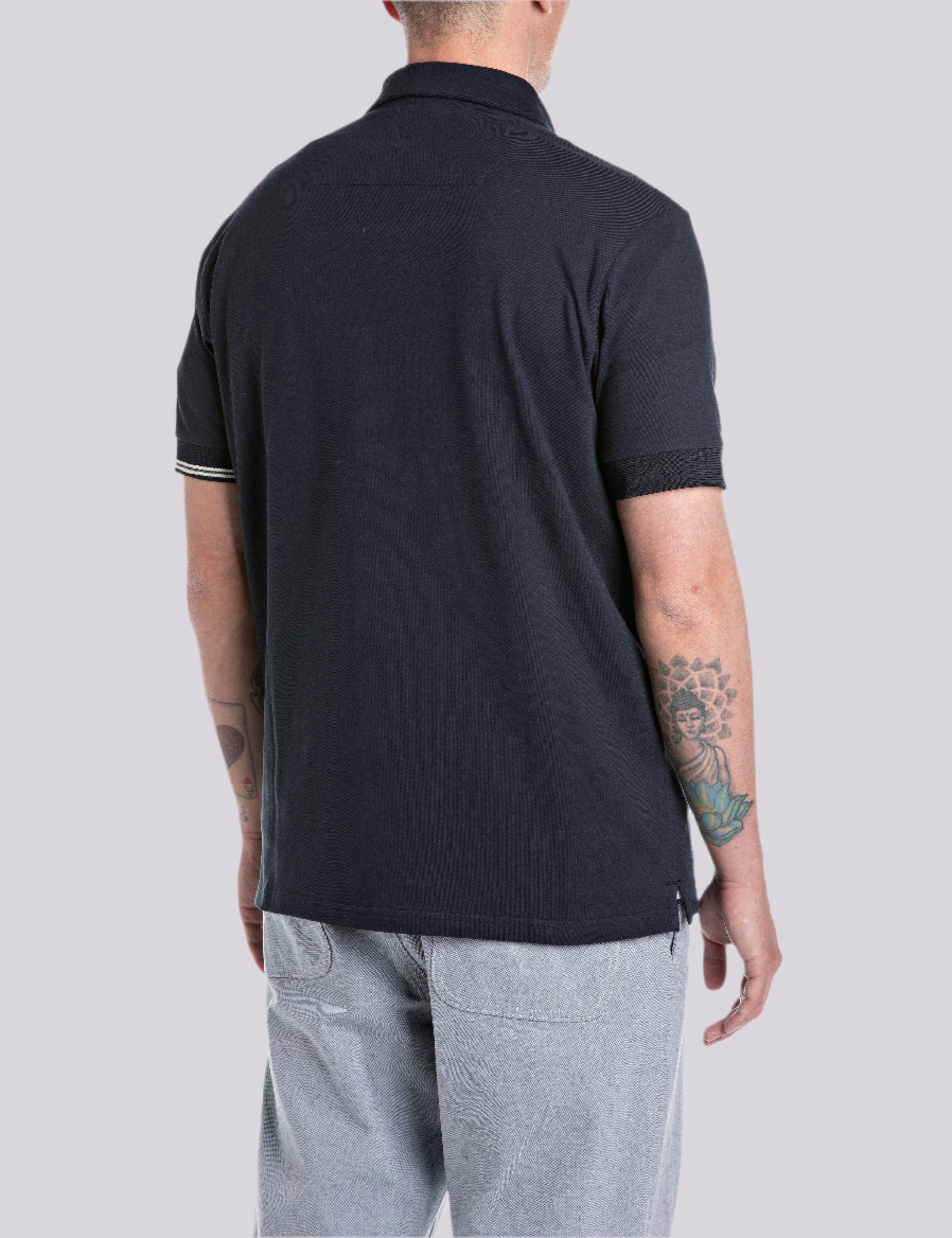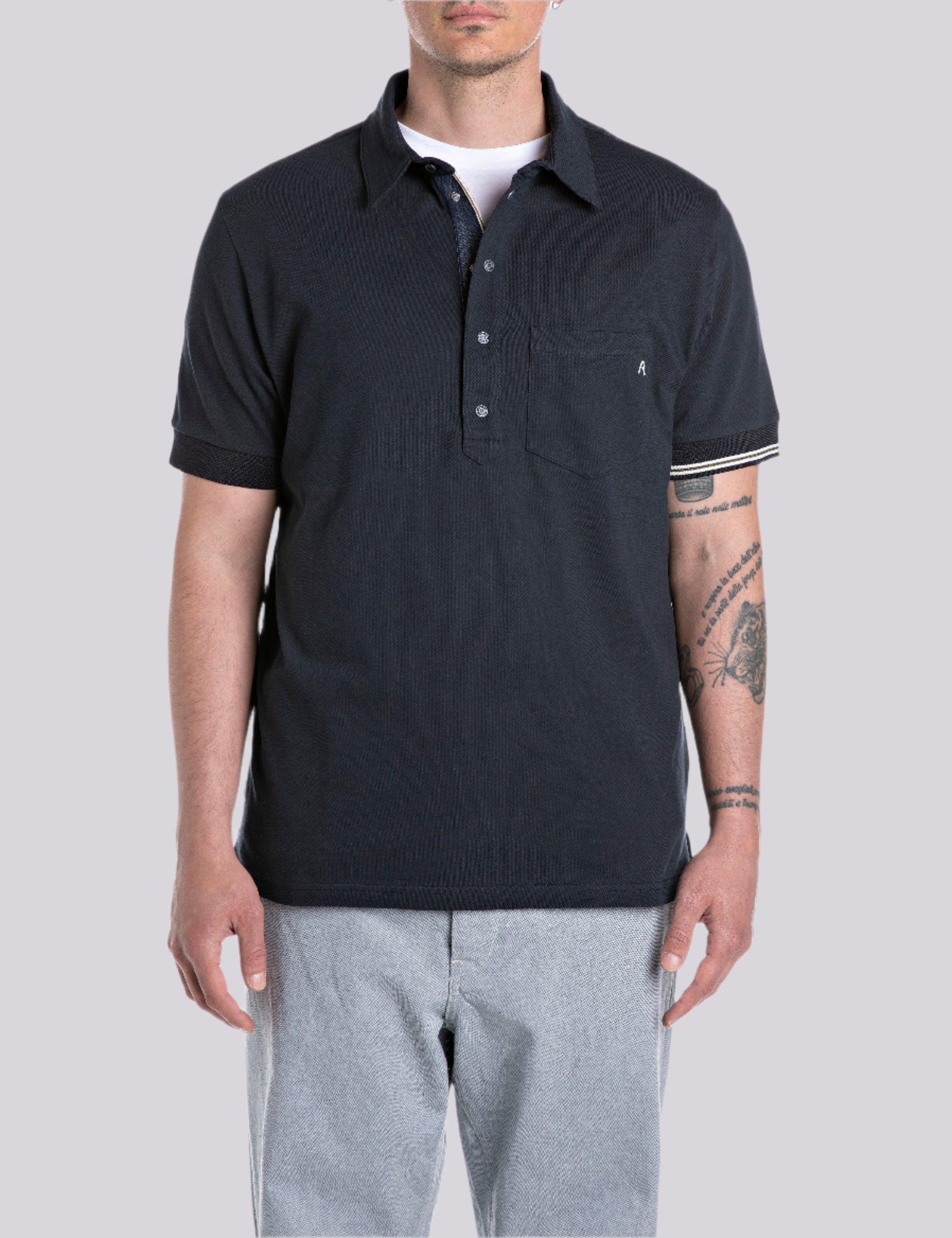 M6894A.000.M21868 Polo marškinėliai trumpomis rankovėmis, su "R" raidės įsiuvu ant krūtinės, užsegimas sagomis.