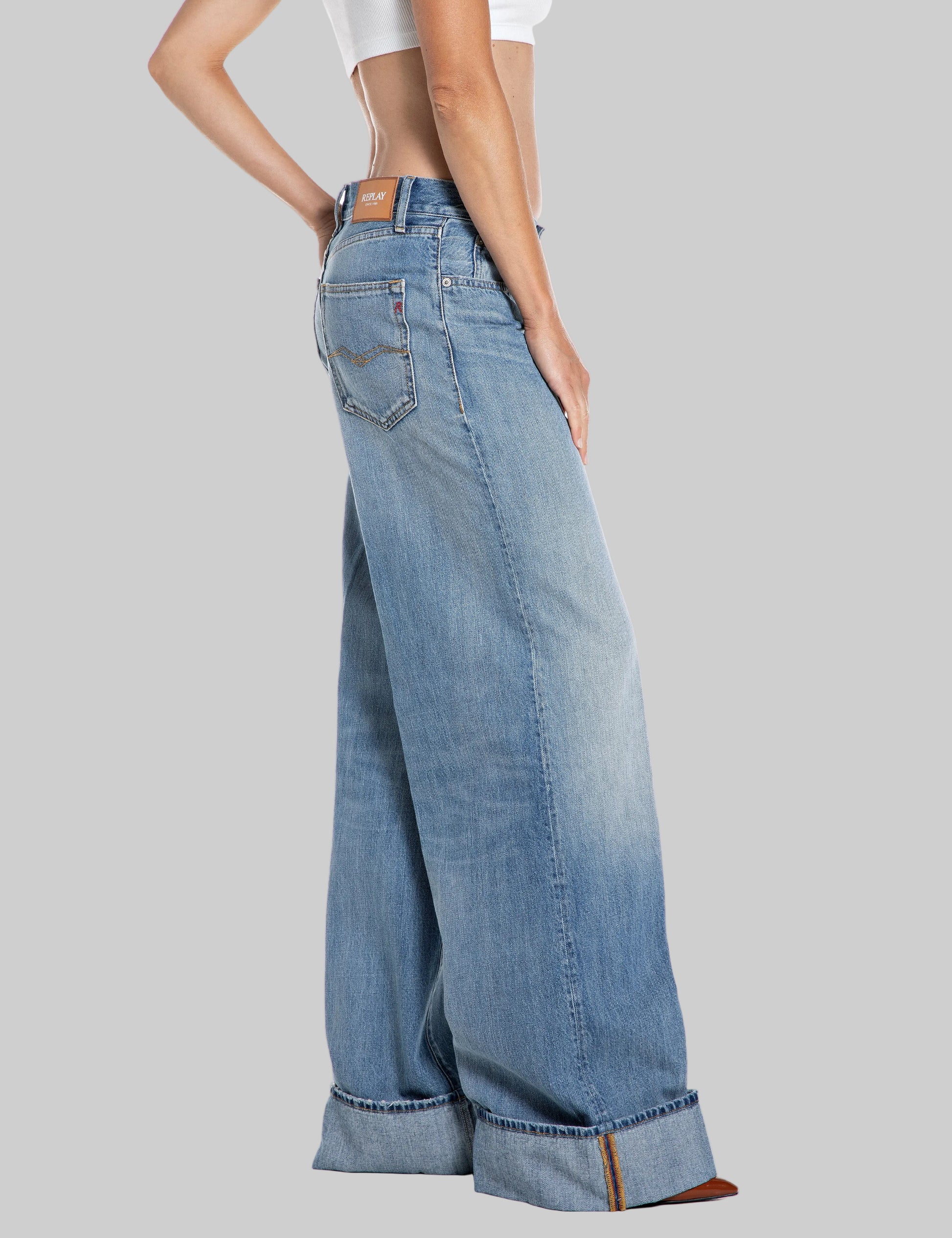WA541 .000.800 161 Platūs džinsai su dviem kišenėmis priekyje ir nugaroje. Užsegimas saga ir užtrauktuku. Žemas liemuo.