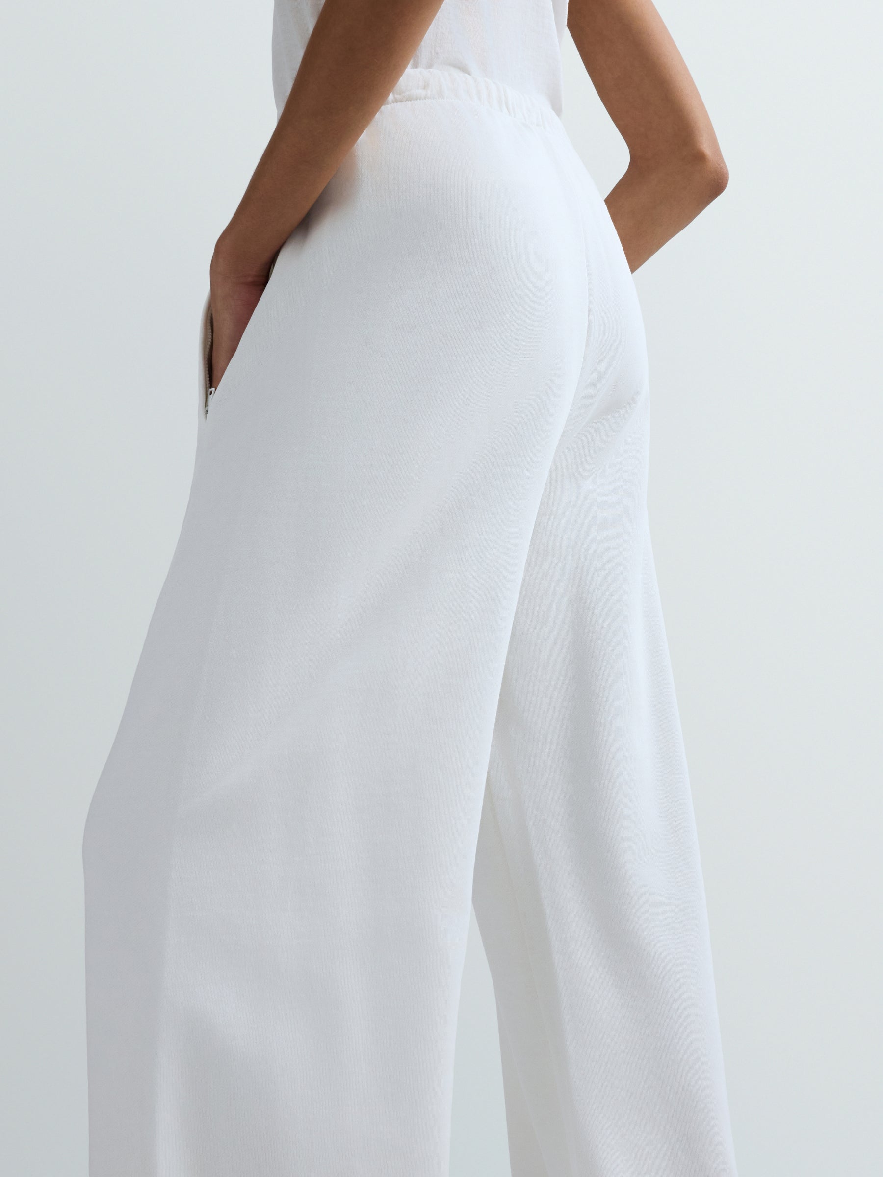 W8159E.000.23802 Plačios minkštos kelnės su dviem kišenėmis priekyje ir prilaikančia guma ties juosmeniu ir raišteliu. "R" raidės įsiuvas šone.